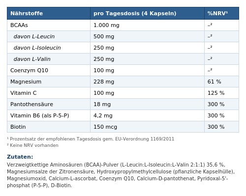 Wichtiger Hinweis: Eine abwechslungsreiche und ausgewogene Ernährung sowie eine gesunde Lebensweise sind wichtig. Nahrungsergänzungsmittel sind kein Ersatz für eine ausgewogene und abwechslungsreiche Ernährung sowie eine gesunde Lebensweise. Die empfohlene Tagesdosis nicht überschreiten. Lagerhinweis: Geschlossen, kühl, trocken und lichtgeschützt außerhalb der Reichweite von kleinen Kindern lagern.